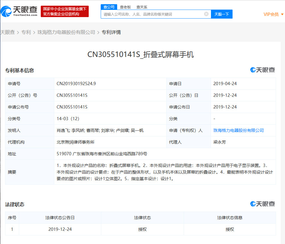 据天眼查专利数据显现,12月24日,珠海格力电器股份有限公司新增专利信息,其于2019年4月24日请求的折叠式屏幕手机专利已成功授权,请求号为CN201930192524.9,请求发布号为CN305510141S。