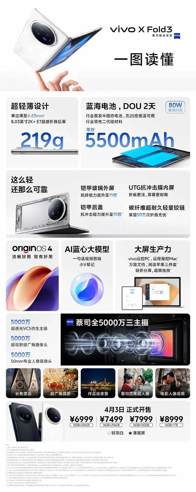 在价格方面,标准版6999元起,Pro版16GB+512GB版别价格9999元,16GB+1TB版别价格10999元。vivo X Fold3系列将在3月26日敞开预售,4月3日正式开售。