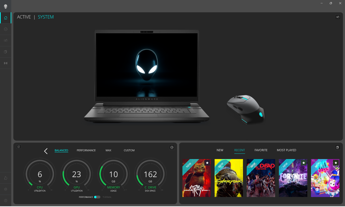 AWCC外星人智动能技能渠道的仪表板愈加简练明晰,能够快速拜访游戏的特定装备文件,以及主题、灯效、音频和超频等对游戏体会至关重要的设置。不只能全面监控机器运转状况,还能个性化调校功用开释、联动ALIENWARE ECO宗族生态、树立玩家个人专属的游戏库,每一步晋级都旨在为用户打造愈加专属、愈加轻松的运用体会。
